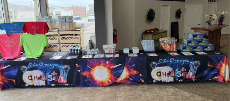 Please set up two, 8’ tables (or three 6’ tables) in the area where guests will be EXITING after the show, typically the church atrium. The Amazing Chemistry Show provides the table coverings. Please recruit two (2) people to set up 1 hour before the show begins for set up and to be present before and after the show.